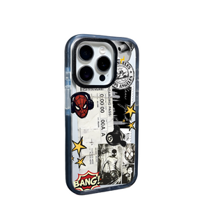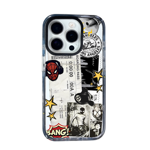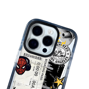 Featuring a mix of urban Los Angeles stamps, boarding pass textures, and dynamic Spider-Man art, this design perfectly blends travel, street culture, and pop style. The black-and-white comic panels, vibrant yellow stars, and “BANG!” graphic add a fun, retro punch to your device — keeping it trendy yet timeless.
